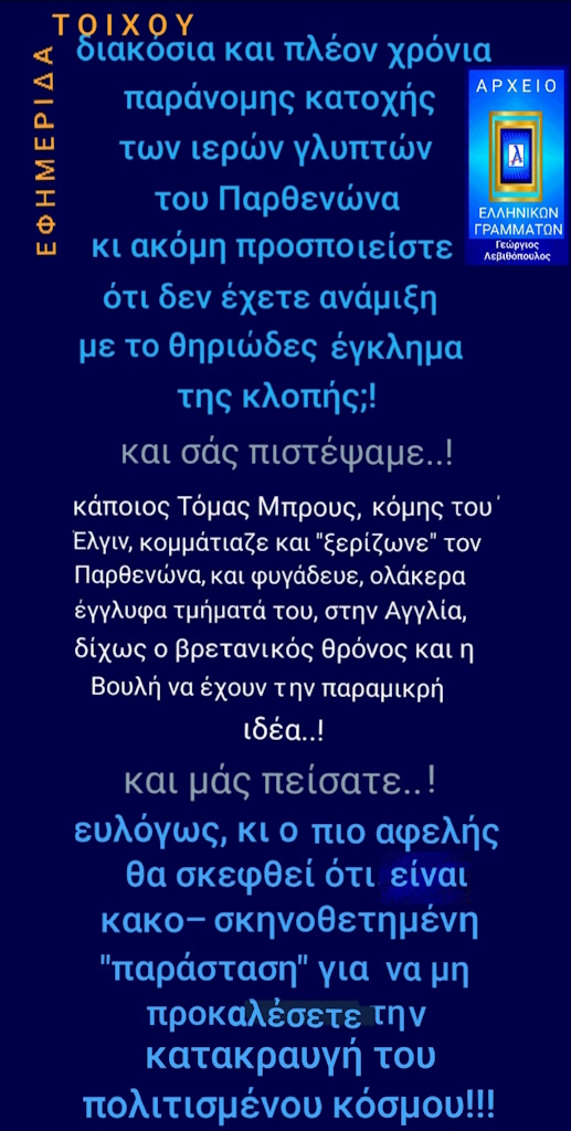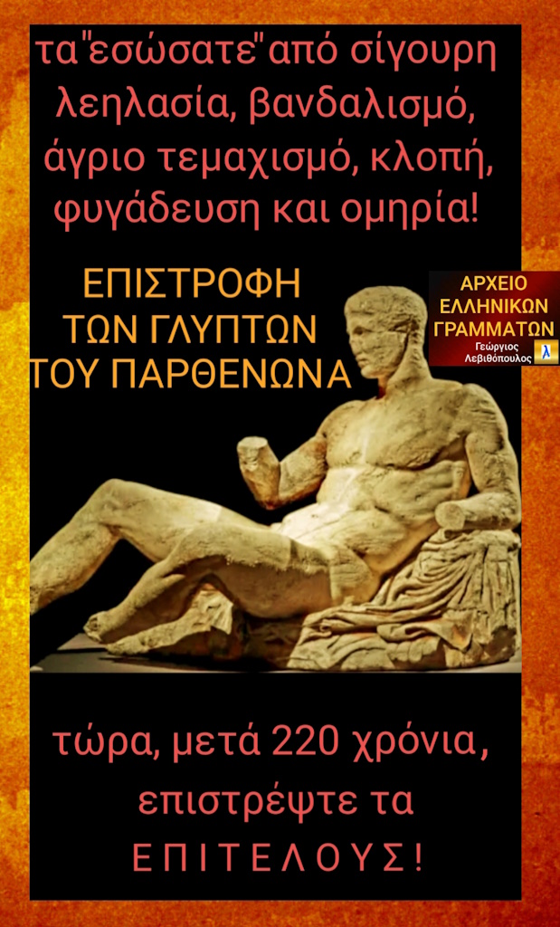 ΑΙΣΧΡΗ ΒΕΒΗΛΩΣΗ ΝΑ ΑΠΟΚΑΛΟΥΝ ΤΑ ΕΛΛΗΝΙΑ ΓΛΥΠΤΑ ΤΟΥ ΚΟΡΥΦΑΙΟΥ ΜΝΗΜΕΙΟΥ ΤΗΣ ΑΝΘΡΩΠΟΤΗΤΑΣ "ΕΛΓΙΝΕΙΑ ΜΑΡΜΑΡΑ", ΔΙΝΟΝΤΑΣ ΤΟΥΣ ΤΟ ΟΝΟΜΑ ΤΟΥ ΑΡΧΑΙΟΚΑΠΗΛΟΥ ΠΟΥ ΤΑ ΤΕΜΑΧΙΣΕ ΚΑΙ ΤΑ ΕΚΛΕΨΕ