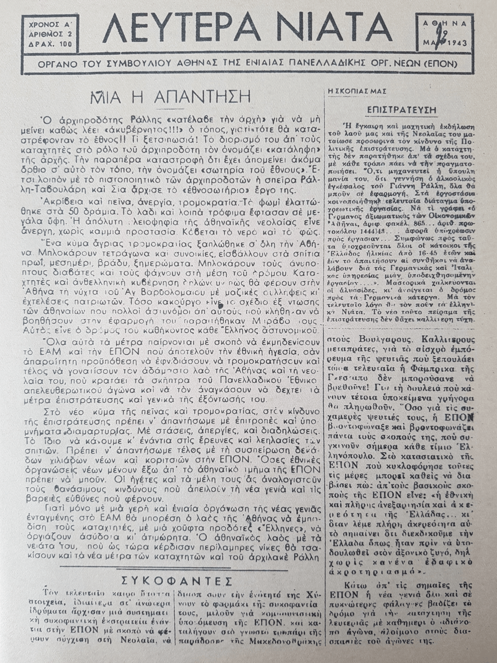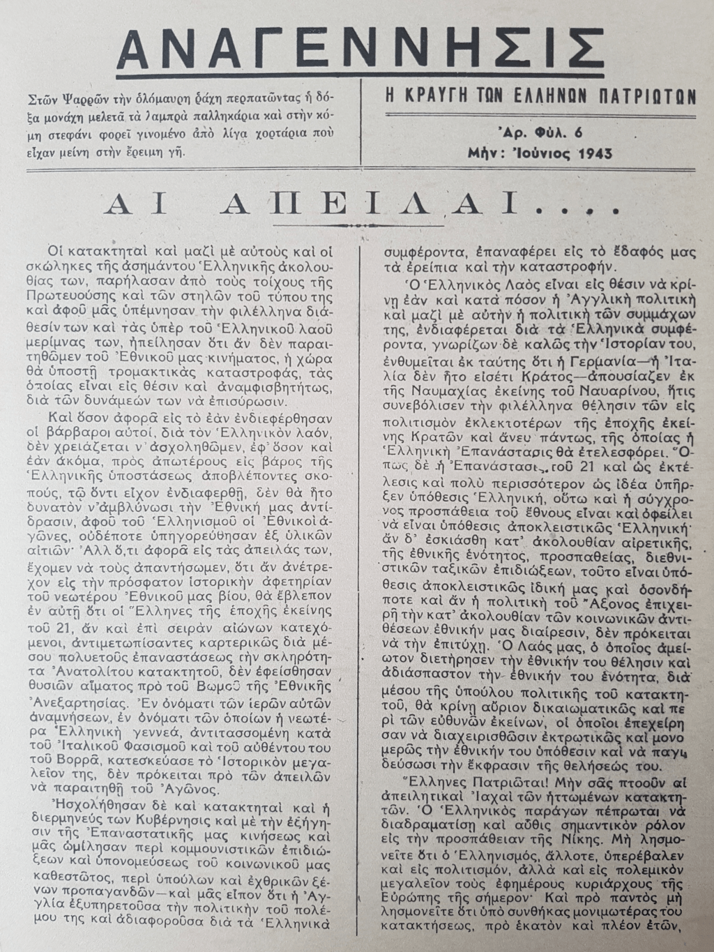 Μια προκήρυξη, ένα εφημεριδάκι, πολλές φορές, όσο μια παλάμη μικρό. Οι αγωνιζόμενοι πατριώτες είχαν στήσει ένα αδιάκοπο παιχνίδι με το θάνατο. Μα, ήταν και μια ανάσα ελευθερίας, έξω από το ασφυκτικό, καρφωμένο φέρετρο, της άμοιρης κατοχικής Ελλάδας.